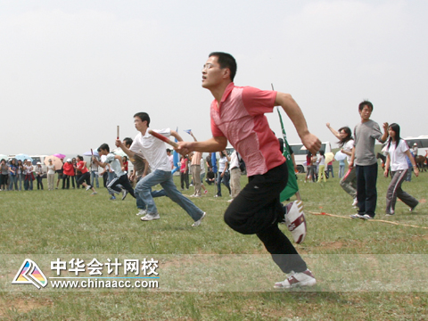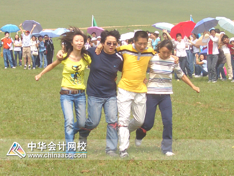 首先开始的是绑腿跑,别的比赛都是两个人绑在一起跑,我们可是四个人绑在一起跑哟。这项运动也是最能培养团队精神的,这些员工在工作中就互相帮助,到了赛场上更是配合得相当默契,各个部门之间的竞争异常激烈,这可就忙坏了计时的裁判,虽然说一个裁判负责一个队,但是真正比起来,临时状况比较多,跑错道的,进错门的,林林总总的突发事件让他们目不暇接,现场听得最多的一句话就是:“客服的呢?……市场的呢?……”